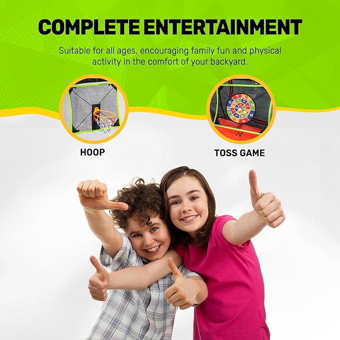 - INNOVATIVE JUMPING SURFACE WITH FUN BONUS GAMES: Our high-tech jumping surface, made in the USA, offers durability and optimal bounce. The integrated target toss game and basketball hoop add extra fun, turning every jump into an exciting game. Ideal for fitness enthusiasts, kids, and family playtime.