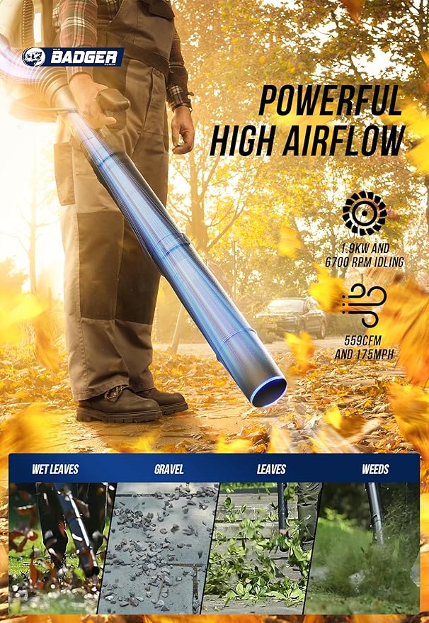 WILD BADGER POWER Leaf Blower Backpack, 53cc Gas Powered Strong Air Flow 559CFM 174MPH, Light Weight 19.6lbs, Ideal for Leaf, Sand, Gravel, Snow, Yard and Driveway