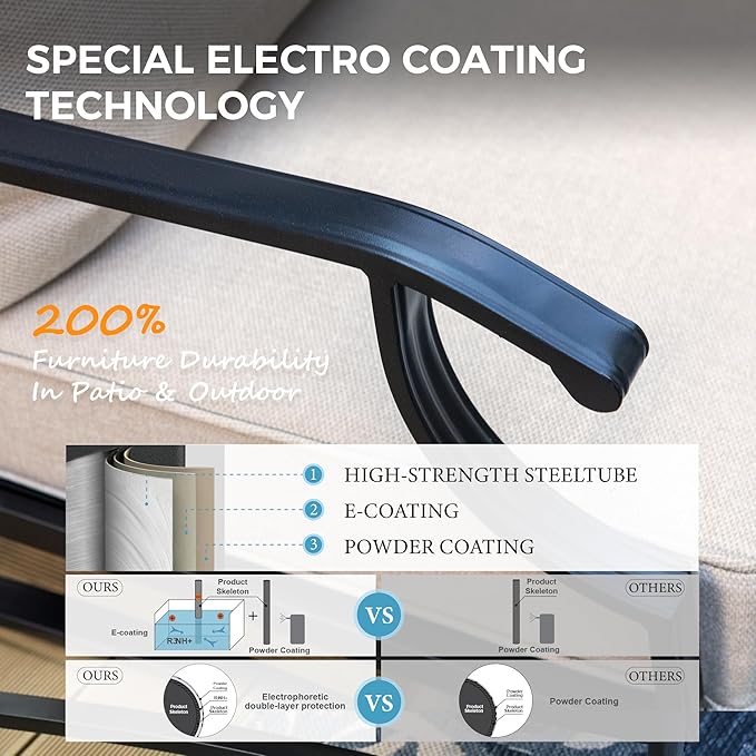 - 【RELIABLE ALL-WEATHER METAL CONSTRUCTION】Built from durable metal with E-COATING and POWDER-COATING finish, ensuring resistance to all weather conditions, rust-proof qualities, and easy maintenance. The sturdy wrought iron frame can withstand various weather conditions, with the single chairs supporting up to 350 lbs and the 3-seater sofa accommodating up to 900 lbs, promising long-lasting reliability and durability