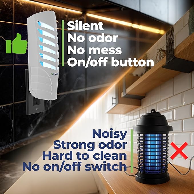 - ELEGANT AND MODERN DESIGN: This fruit fly killer features a clean white and black design that fits well with any decor. The light is angled towards the wall or floor to avoid direct eye exposure.
