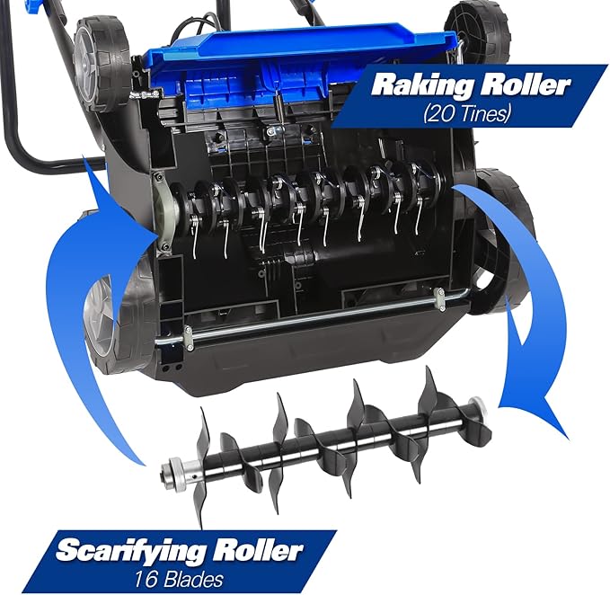 - Scarifying and Raking Mastery - A Lawn's Best Friends: Experience the art of scarifying and raking with finesse. Our dethatcher boasts a scarifying roller adorned with 16 precision blades, aerating your lawn to perfection. Complementing this prowess, the lawn rake cylinder showcases 20 robust spring steel tines, meticulously picking up maximum thatch for an immaculate result.