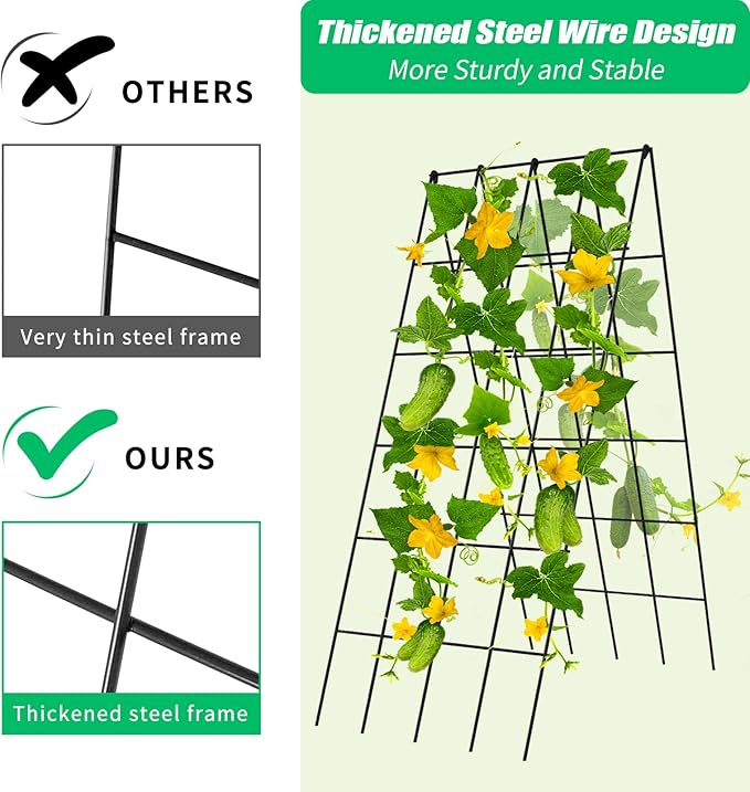 - A-FRAME DESIGN -- A-frame cucumber trellis can grow various plants from both sides of the trellis. These shapes promote airflow for the climber, and the plant will have plenty of sunlight to maximize photosynthesis. Let you get a better harvest.