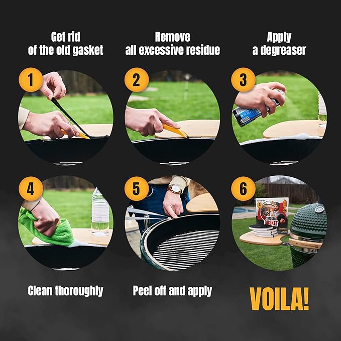 - ✔️ [ HI TEMP RESISTANCE ] With strong adhesion, the self-adhesive BBQ high heat gasket for smokers is easy to stick and apply and fits the most grills: 1. Scrape / Remove the old gasket; 2. Clean and degrease the surface; 3. Peel off safe-adhesive backing (as the adhesive might be very strong, you can use an oblique cut to get rid of the paper backing); 4. Stick the gasket around the edge of the Grill and its lid; 5. Cut the excessive length; 6. Close the lid and wait for 12 hours.