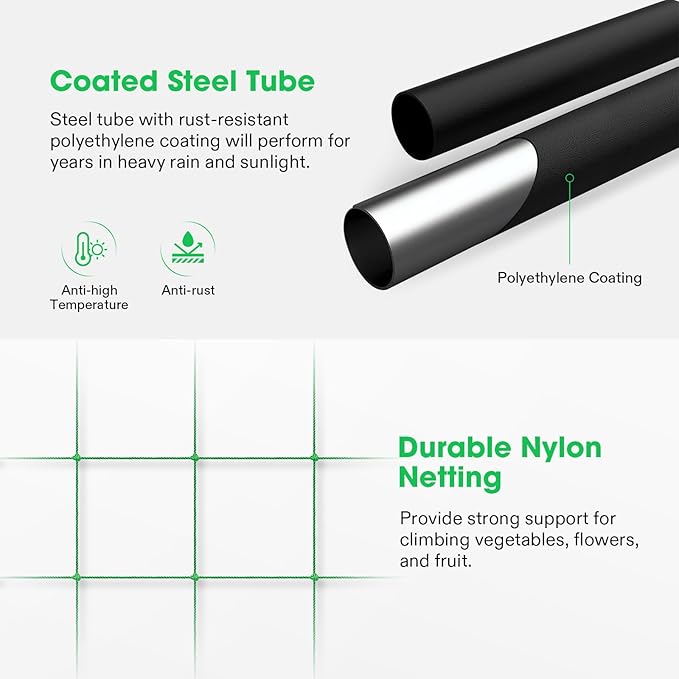 - Durable Material: Steel tube with rust-resistant polyethylene coating will perform for years in heavy rain and sunlight; Durable nylon netting provides strong support for climbing vegetables, flowers, and fruit
