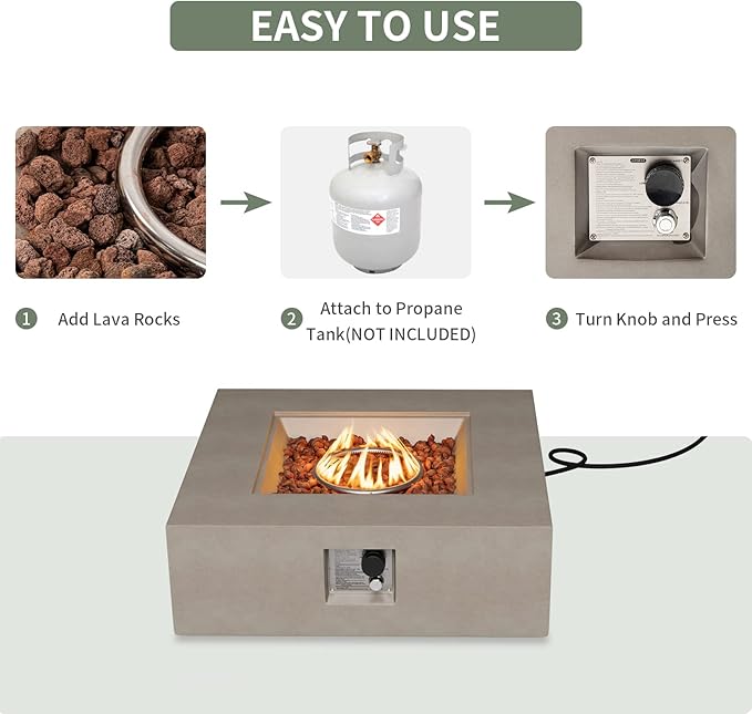 - 🔥【Perfect Dimensions 】: Large enough table surface to set your brandy snifters and keep them warm as the evening lingers on. The unit is 35-inch square and just 13-inch from the ground for an almost sunken feeling. The burning area is 21-inch square. It perfectly fits a standard 20lb propane tank, which should be put outside the fire pit (can not put inside of it). The entire piece weighs only 84 lbs and can easily be picked up from the side handles by 2 people.