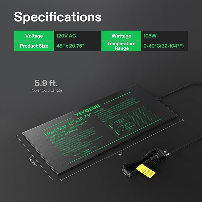 - Multiple Uses:: This 48" x 20.75" heating pad with a 5.9ft power cord is suitable for 4pcs standard 1020 trays and slightly larger than comparable mats on the market; It also runs on only 105 Watts to help you save on electricity; It can not only use for plant sprouting and other indoor gardening but also for home brewing and terrarium warming, meeting your different daily needs