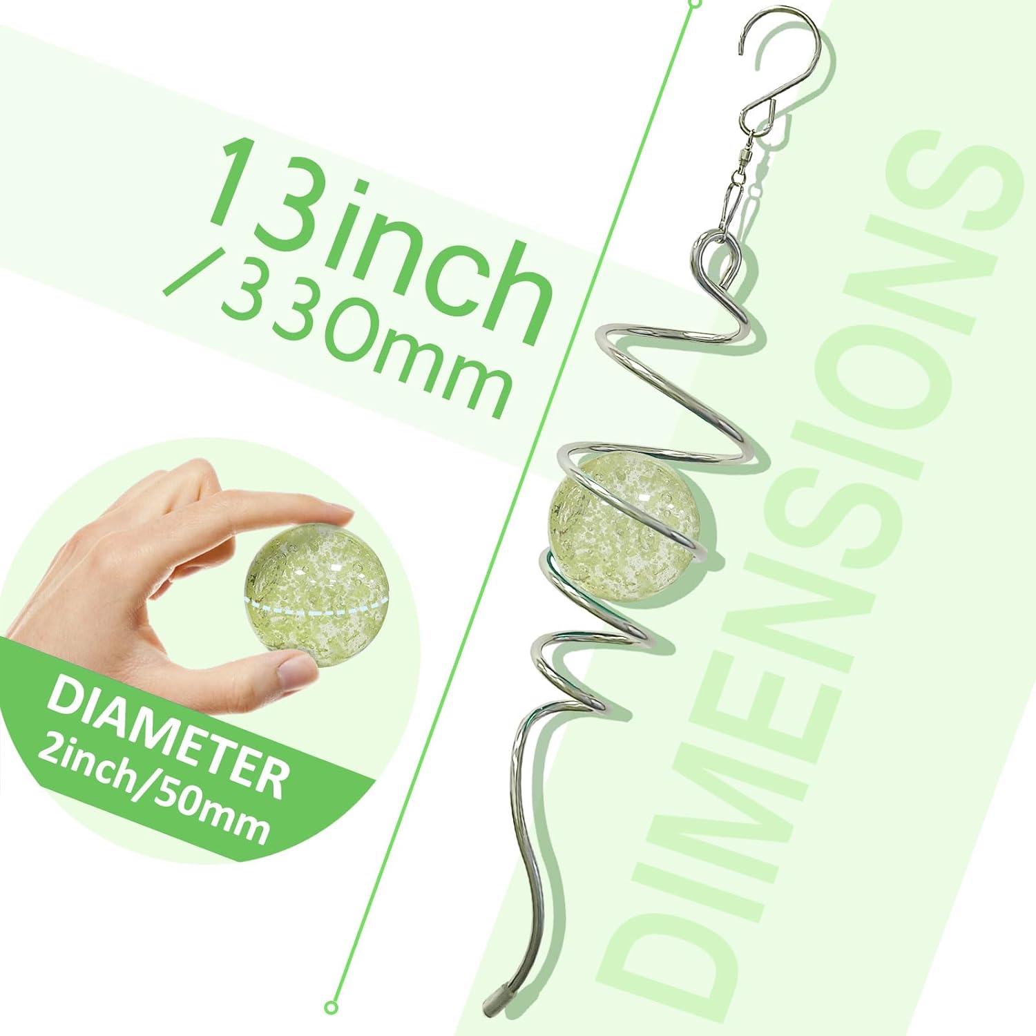 - 【EASY TO POSITION】:The wind spinner spiral can't spin by itself ,if you want to make it spin like the video ,need add 1pc motor (not include) ,or combine it with a wind spinner or any rotatable hanging ornament to help it rotate. Come with 1pc 2 inch colored glass orb(not paint), 1pc silver color spiral tail twister,and 1pc swivel hook accessory, ready to hang and enjoy.
