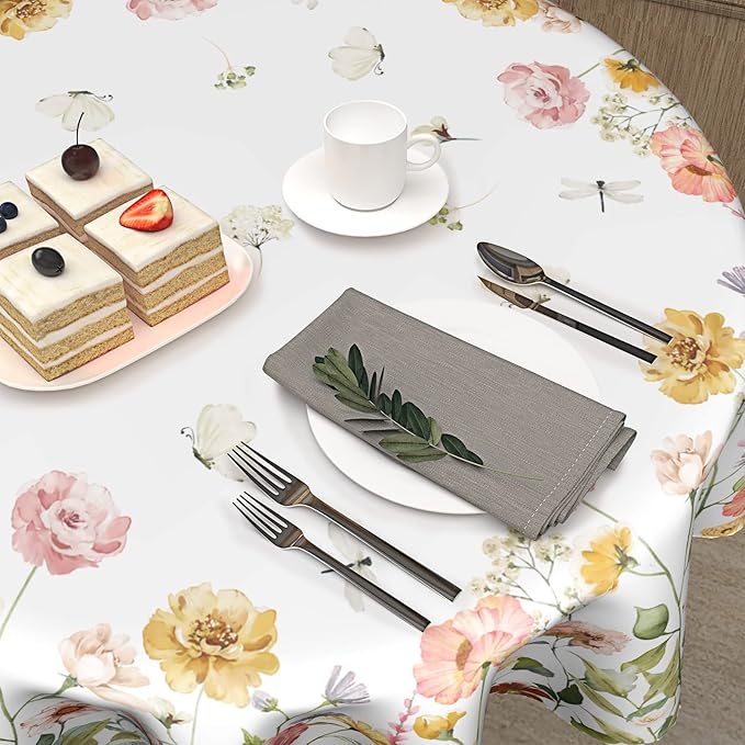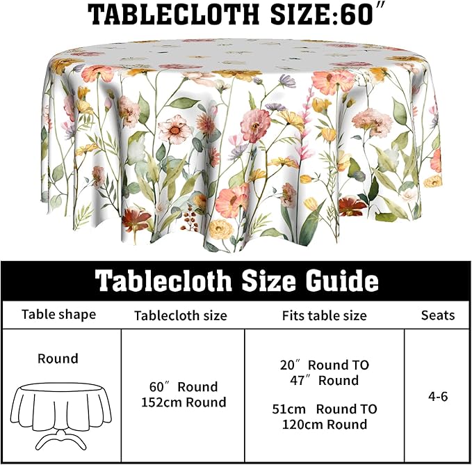 - 【EASY CARE】: A simple wipe with a damp cloth after a meal will clean off liquids such as coffee, juice and wine. Besides that, our watercolor wildflower table cloth round is machine washable, just put it in a laundry bag and wash them in cold water on a gentle mode, taking care not to bleach it, and iron it on low heat if needed.