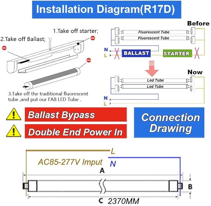 - 🌞【Easy to Install】When you take144w r17d 8 foot led bulbs to replace two pin fluorescent light bulbs ,Just simply bypass the ballast and connection AC85-277V AC power . Not compatible with single-ended powered sockets