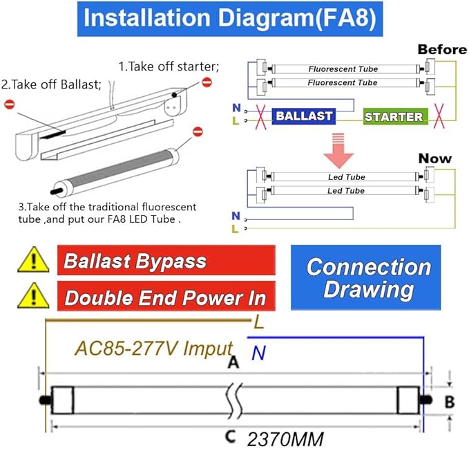 - ✅【Easy to Install】When you take 144w fa8 8 foot led bulbs to replace 1 pin fluorescent light bulbs ,Just simply bypass the ballast and connection AC85-277V AC power . Not compatible with single-ended powered sockets