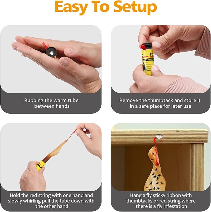 - Easy to Set Up: Fly sticky trap are very convenient to use. Rub between hands to warm up tube. Pull the red cord to open the ribbon. Pull the ribbon using a counter clockwise motion to avoid tearing. Hang the ribbon where flies are by using the thumbtack through the red loop.