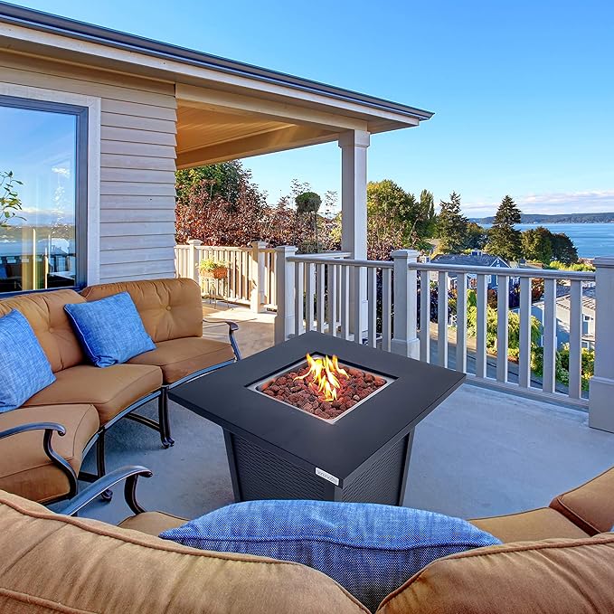 - ENVIRONMENT SAFE: This CSA approved and safe patio fire pit propane bonfire table set can generate up to 40,000 BTU by using liquid propane fuel for stable and clean combustion so there is no ash or smoke to protect your health and the environment