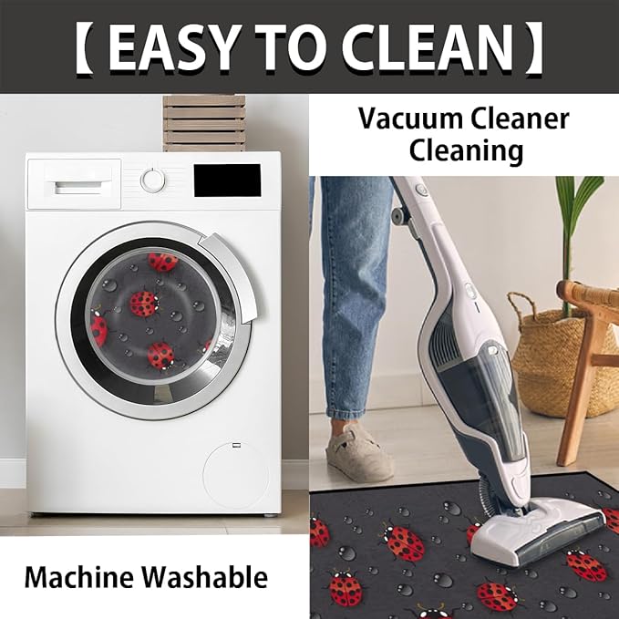- EASY CARE: This ladybug half round doormat is easy to clean, just vacuum with a hand-held vacuum cleaner, sweep with a broom, or shake it off outdoors or above a trash can. If you need more in-depth cleaning, it can be machine washed, or you can use a damp cloth dipped in a small amount of mild soap to wipe clean.