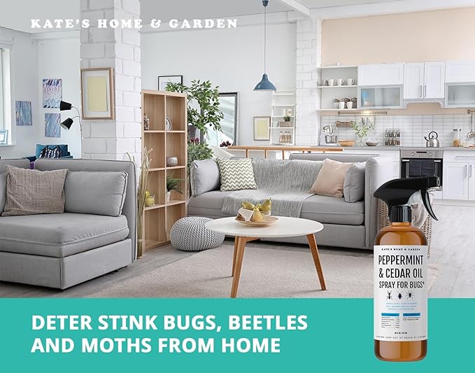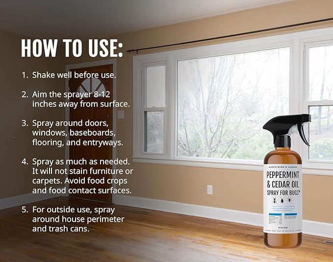 - PEPPERMINT OIL SPRAY FOR BUGS: This natural bug repellent is made with peppermint oil and cedarwood oil for pest control; it works indoor and outdoor by repelling bug, spiders, stink bugs, earwigs, flies, cats and rodents from crawling over all your house, basement, attics, and yard; this is why Kate's Home & Garden insect repellent is a great indoor insect & pest control spray for insects and is a great household supply and camping essential because it's a natural ant killer and has a clean fresh smell
