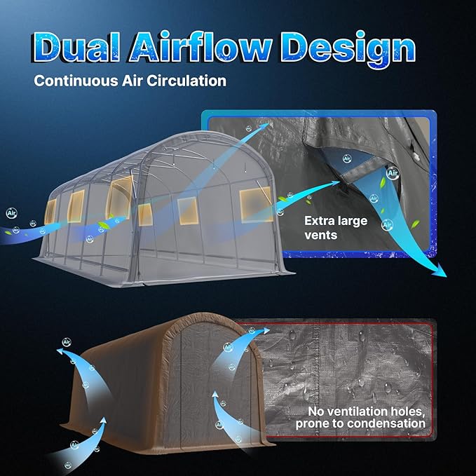 - 【Various Use】The portable storage shelter can be a boat storage shelter, ATV storage shed, truck storage tent, or big vehicle garage shelter. It is also suitable for large machinery, firewood, or any other gardening tools.