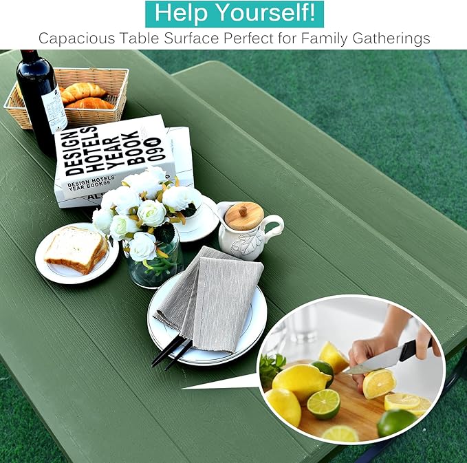 Moccha Picnic Table Bench Set - Portable Plastic Picnic Table w/Steel Frame & Wood-Like Texture, All Weather Heavy Duty Picnic Table Kit, Picnic Tables for Outdoors Garden Patio Party Dining (Green)