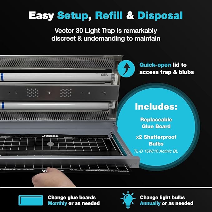 - INDUSTRIAL STRENGTH UV TRAP: Catchmaster's Insect Vector 30 Light Trap is remarkably discreet and undemanding to maintain. It's made with airplane-grade aluminum casing and an industrial-strength design for increased durability. This ultra-sturdy indoor fly trap for home comes with a replaceable glue board and 2 shatterproof 30-Watt bulbs (Philips TL-D 15W Actinic BL)
