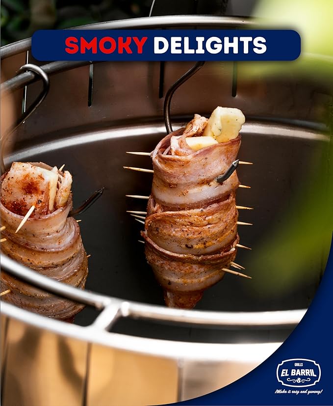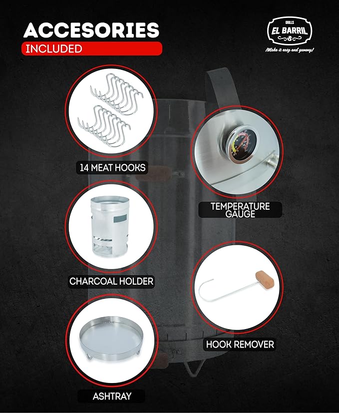 - Smart & Handy: Our portable Smoker & Grill Barrel with 4 heat-resistant handles can hold 45lbs of meat, comes with 14 Hooks, 1 Hook Remover, 1 Ventilated Charcoal Holder an ashtray with a temperature Gauge perfect for camping, tailgating, picnics, a beach or balconies