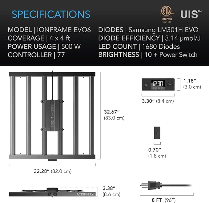 - 5 x 5 ft. Veg. Coverage | 4 x 4 ft. Flower Coverage | Samsung LM301H EVO Chips | 1680 Diodes | 500W | 1991 PPFD | ETL Cert. 5021417