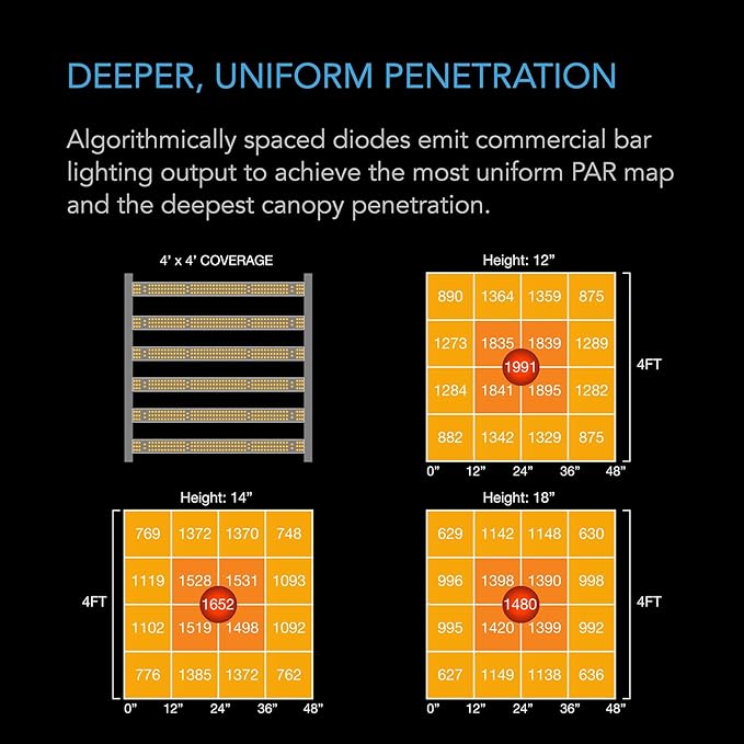 - Bar-style fixture with algorithmically spaced diodes optimized for even coverage, deep canopy penetration, and hotspot reduction.