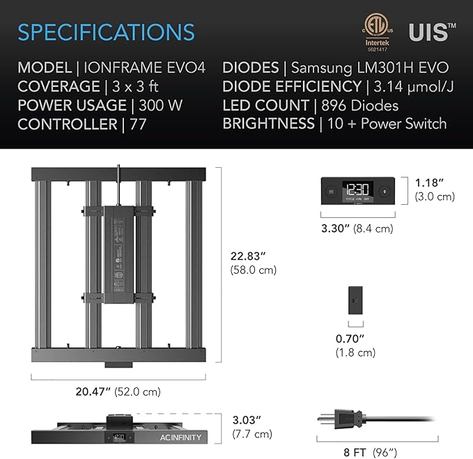 - 4 x 4 ft. Veg. Coverage | 3 x 3 ft. Flower Coverage | Samsung LM301H EVO Chips | 896 Diodes | 300W | 1819 PPFD | ETL Cert. 5021417