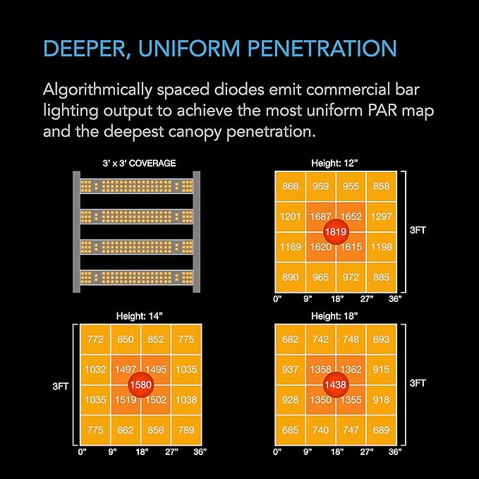 - Bar-style fixture with algorithmically spaced diodes optimized for even coverage, deep canopy penetration, and hotspot reduction.