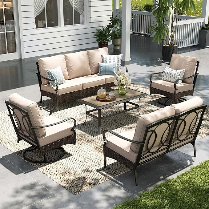 Sophia & William Metal Patio Furniture Set, 7 Seats Outdoor Conversation Set with 3-Seater Sofa, 2 Swivel Chairs, 1 Loveseat, 1 Coffee Table for Seating, Lawn Porch Backyard,Beige