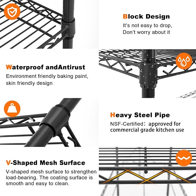 - 【HIGH-QUALITY MATERIAL】: This metal shelf is made of heavy steel, so it has extremely strong load-bearing capacity. The metal rack is covered with a powder coat finish that not only has a smooth finish, but also resists water, rust or corrosion. Placing the shelving unit in your kitchen or laundry room is no problem.