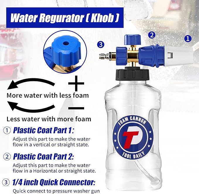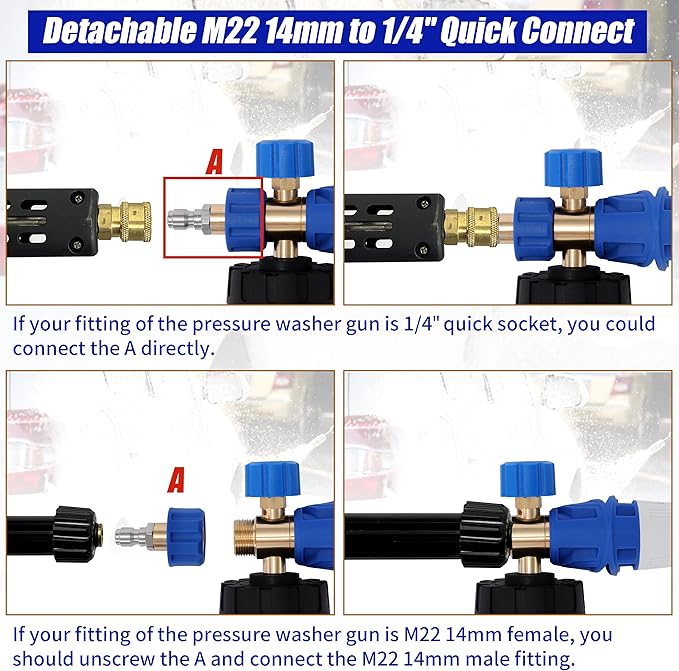 - EASY CONNECTION: Our snow foam cannon offers versatile connection options. You can connect it to a pressure washer gun using the detachable 1/4" quick connector. Simply remove the 1/4" quick connector to connect the foam cannon directly to a pressure washer gun with M22 14mm threads.