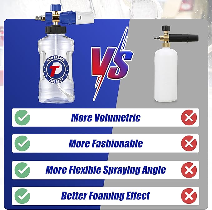 - UPGRADED FEATURES: Our foam cannonsโ working pressure is 1000 psi to 3600 psi. The container bottle features a larger mouth for easy filling and an extra-wide neck to prevent cracking and leaking. The foam sprayer comes with a 1/4โ fitting and has a container capacity of 1.5 Liters / 0.33 Gallons. With a larger capacity foam cannon, you can clean for longer periods of time and tackle larger cleaning jobs.