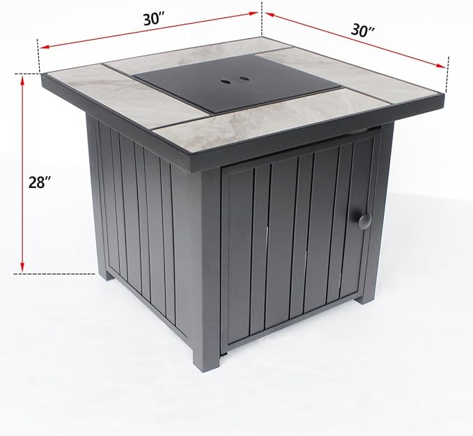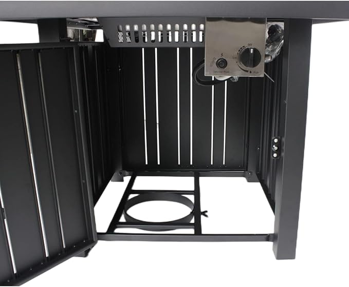 - [Easy to Use & Smokeless Flame]The fire pit table equipped with a quick start electronic ignition system and variable flame control. You can light up the fire table safely and adjust the flame to desired temperature by turning the control button. The side door panel can be easily opened to change and conceal the propane tank, work with a standard 20-pound propane tank (NOT INCLUDED). Safety Note: When setting up the propane tank to keep the hose and valve away from the high-temperature area.