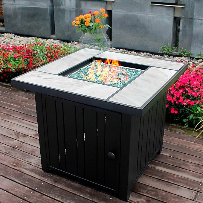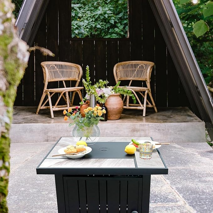 - [Beautiful Design] The fire table has wicker side plate and a beautiful real ceramic tabletop which has naturally formed lines, it can match various of patio furniture and dress up your yard graceful. Also, it's easy to clean. We send 9 lbs transparent glass rocks,the fire glass reflect the beating beautiful firelight make party more cheerful.We can provide replacement parts for the product. If you have any questions, please contact us.