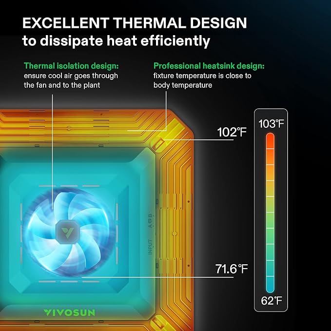 - Integrated Circulation Fan: The centrally located circulation fan in the LED balances airflow where other fans cannot reach, allowing more air to enter the canopy directly; To unlock additional features, the fan must be used with the Vivosun Growhub Controller ( E42A/E25), available for separate purchase
