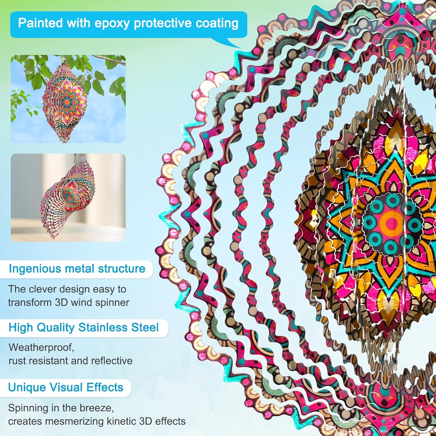 - 【Kinetic 3D Wind Spinner】The kinetic 3D mandala wind spinner has a stunning 3D mandala design that the unique flow of light surface adds vibrant colour and movement! This kinetic art metal wind spinner will add charm to your garden or yard.