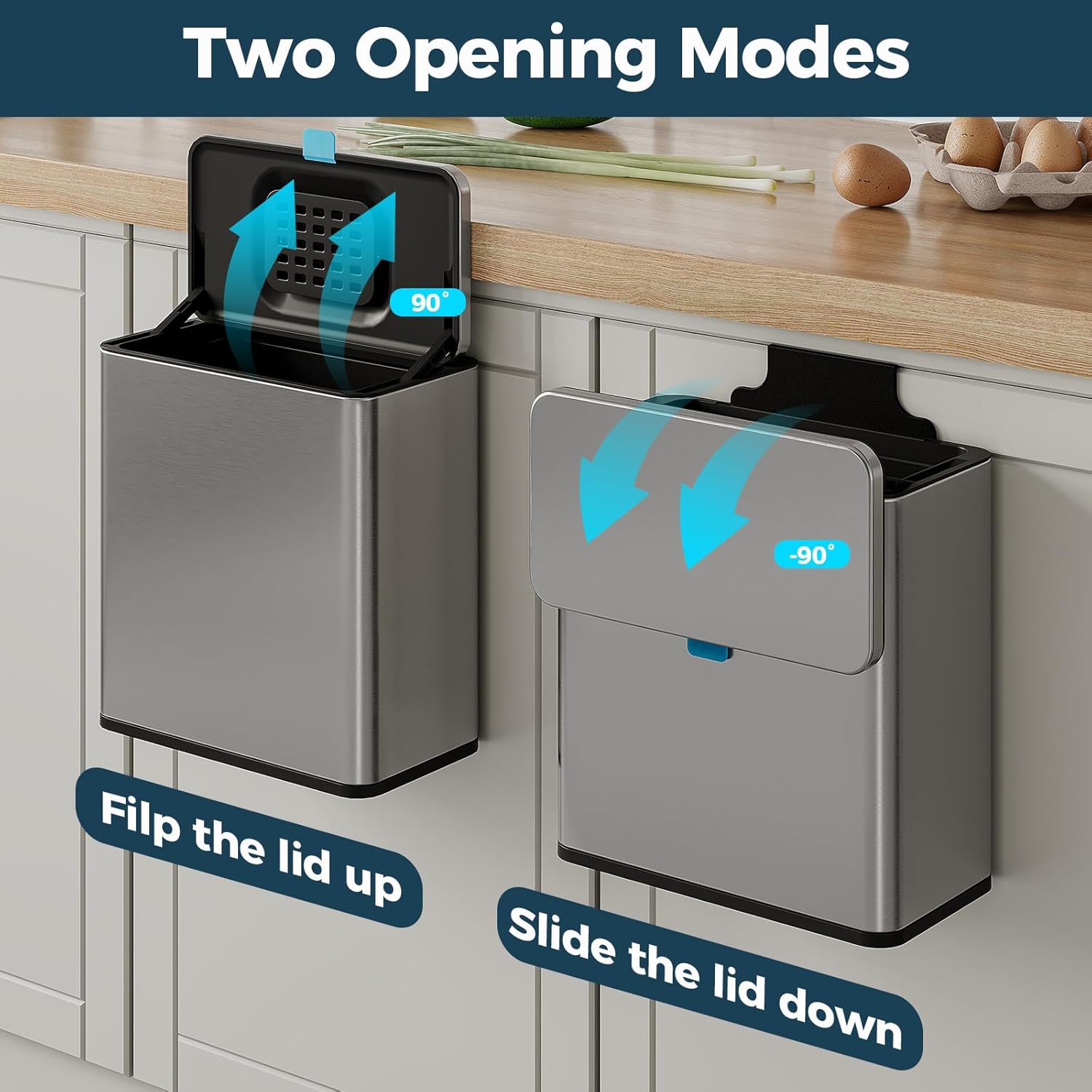 - Two Opening Modes - Flip up the lid or Slide the lid down, Come with a comfortable silicone carrying handle allows you to dispose of the waste quickly and cleanly with a simple pull or slide, depending on your habits and position.