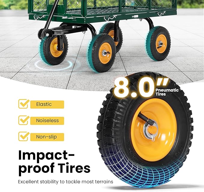 - IMPACT-PROOF TIRES - The load-bearing, shock-absorption, and noise-reduction of the cart are all determined by the casters; Compared with small wheels, four 8’’ pneumatic tires allow for easy maneuverability on rough terrain; The tread pattern of tires increases the friction with the ground; PLEASE BE AWARE that the tires should not be fully inflated due to safe transport consideration