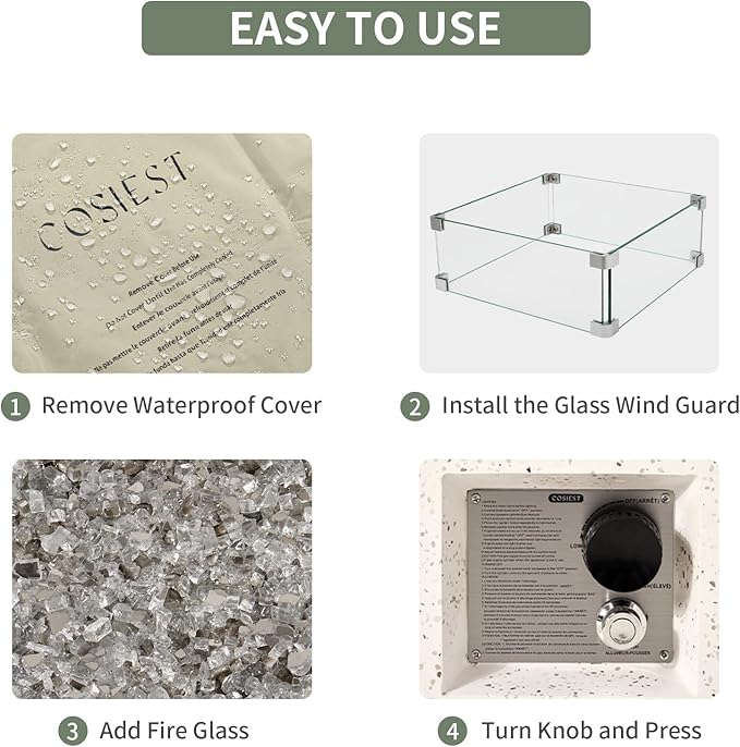 - ๐ฅ ใ Transparent Gray Fire Glass ใ: Transparent Gray fire glass pieces fill the burner bowl and adds a different color to this fire table. No soot or ash to clean up and no smoke as with wood burning or charcoal. Clean burning propane stays lit with no smoking and is better for the environment. The unit comes with a heavy duty waterproof cover to keep it clean and dry when not in use. Built-in side handles for easily moving. Wind guard and waterproof cover for protecting.