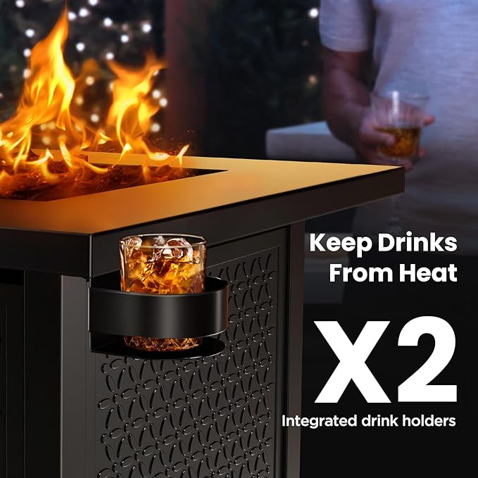 - Convenient Cup Holders: The gas fire pit is designed for ultimate comfort and convenience. Store your drink in one of the two cup holders that are installed securely underneath the tabletop edge. Keep your beverage close enough for easy access, but just far enough away to avoid intense heat.