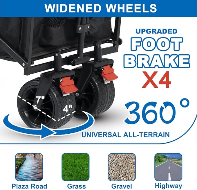 - 🛒Stable & Safe Foldable Wagons: 360° universal 4" widened and 7" diameter large all-terrain wheels, no matter on the beach, grass, gravel road or bad road conditions, it can drive stably and bring you a more comfortable experience. Equipped with 4 foot brakes, it can help us control the cart more easily and keep the stability of the cart, improving the safety of us.