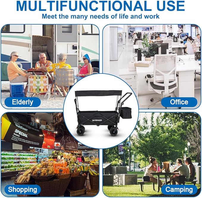 - 🛒Multipurpose Wagon Cart: Equipped with UV shield and safety belt, it can protect our children or items from the sun. Whether it is outdoors or indoors, we can use this stroller with confidence. This stroller is not only suitable for daily family use such as taking children and shopping, but also for travel, camping, garden, barbecues, office and many other occasions, making your life more colorful.