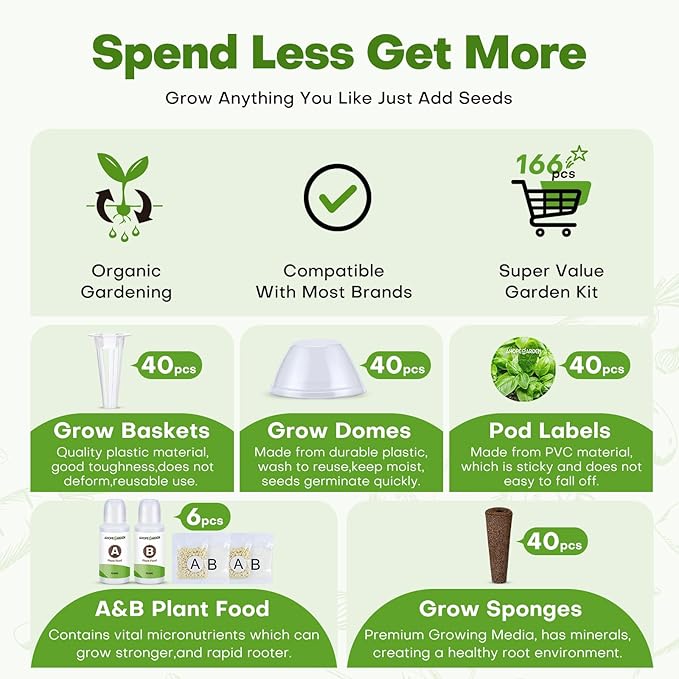 Ahopegarden 166PCS Hydroponic Pods Kit: Indoor Garden Supplies for Aerogarden, iDOO, Most Brand Hydroponics Growing System, with Grow Sponges, Labels, A&B Plant Food, Grow Baskets, Covers & Tweezer