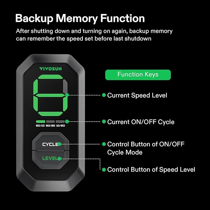 - E12 Speed Controller: Ten fan speeds controlled by PWM can be selected by you; Turn off and then on again will allow the backup memory to recall the speed that was previously set; Three ON/OFF cycle mode can achieve the cycle of wind speed to save power; The controller can be integrated with the App system for intelligent remote control
