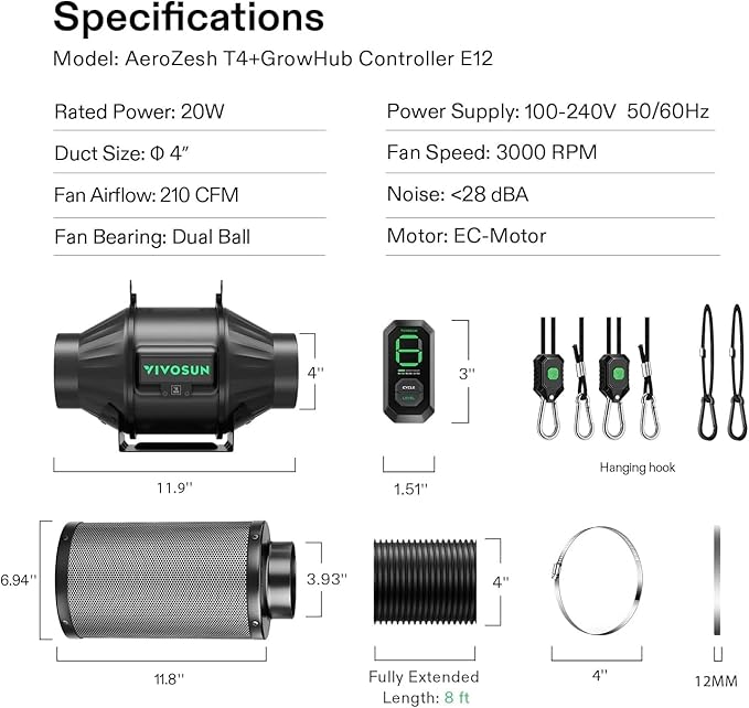 - Efficient Cooling & Ventilation Kit: Includes AeroZesh T4 4” Inline Duct Fan, E12 Speed Controller, 4” Black Carbon Filter, and φ4” 8' Black Ducting; Ideal for moving and transporting air in various air circulation and ventilation projects; Allows for precise and easy control over the fan speed and airflow, stabilizing and optimizing your growth environment