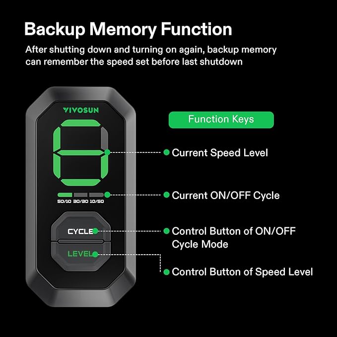 - E12 Speed Controller: Ten fan speeds controlled by PWM can be selected by you; Turn off and then on again will allow the backup memory to recall the speed that was previously set; Three ON/OFF cycle mode can achieve the cycle of wind speed to save power; The controller can be integrated with the App system for intelligent remote control