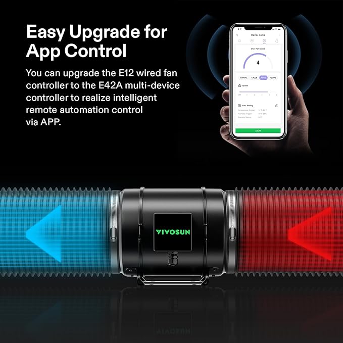- E12 Speed Controller: Ten fan speeds controlled by PWM can be selected by you; Turn off and then on again will allow the backup memory to recall the speed that was previously set; Three ON/OFF cycle mode can achieve the cycle of wind speed to save power; The controller can be integrated with the App system for intelligent remote control