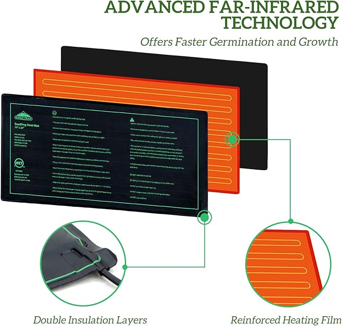 - STABLE & EVEN HEATING: The advanced far-infrared technology ensures that your seeds enjoy a warm and comfortable environment for faster germination and growth. The reinforced heating film, with double insulation layers, ensures the tap root will not be scorched, and when the moist seedling tray is covered with a dome the mat can help produce invigorating humidity.
