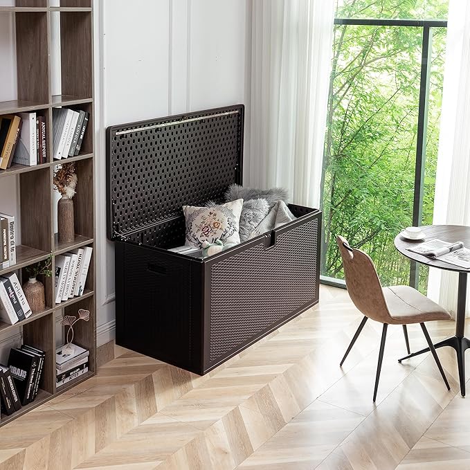 - Large Outdoor Storage for Patio Furniture: Storage Box provides enough room & large capacity to accommodate both indoor and outdoor storage needs. Perfect Storage Container for a Clutter-Free Home. Store your outdoor patio cushions or garden tools, sports equipment, toys, blankets, tools, pool accessories, and more in this deck box.