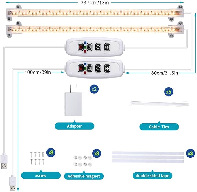 - 【Material Safety & Easy Installation】All aluminum material, strong corrosion resistance, hard to melt. The grow light pack comes with screws, ties, double-sided tapes and magnets to provide four mounting options. Compact design fits for various fixtures and surfaces. The power cord is 71 inches long for easy using in office,indoor,plant shelf,greenhouse etc.