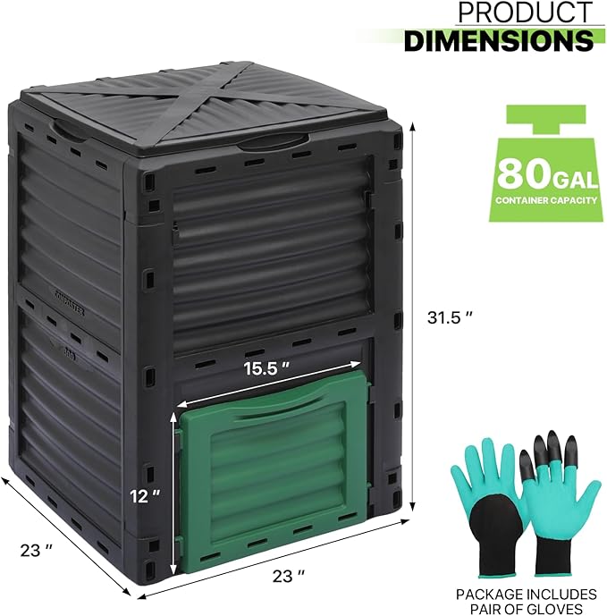 - BPA-Free Material: Made from sturdy materials that are free from harmful BPA, this composter is better for the environment and can handle tough outdoor conditions, including winter. The black plastic used retains heat and controls moisture well, which speeds up the composting process.