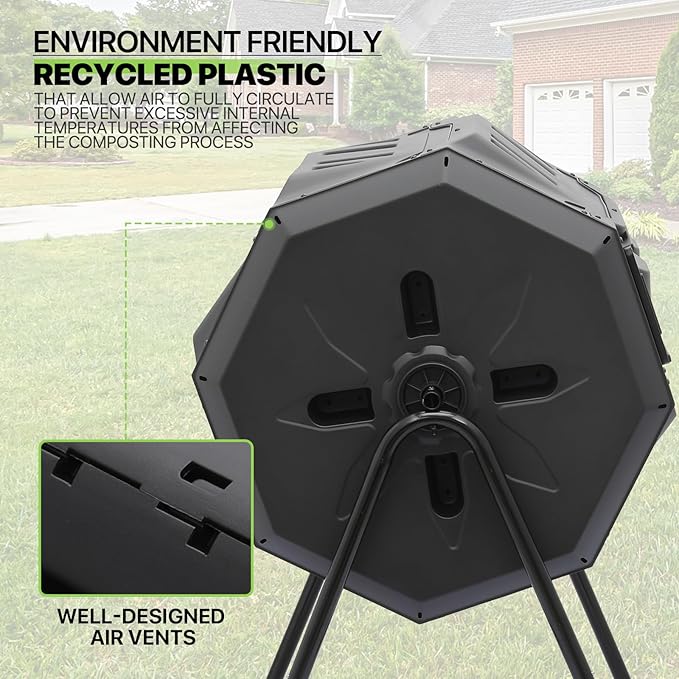- BPA-Free Material: Made from sturdy materials that are free from harmful BPA, this composter is better for the environment and can handle tough outdoor conditions, including winter. The black plastic used retains heat and controls moisture well, which speeds up the composting process.